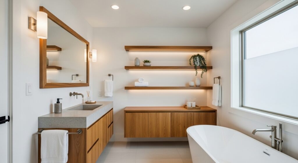 Even small touches can make a noticeable difference. In my experience, incorporating wood through vanities, shelves, or accessories helps soften the overall design. The key is to keep the tones consistent so the space feels cohesive. This approach creates a natural, calming environment that feels both stylish and comfortable, turning your bathroom into a space that feels more like part of your home rather than just a functional area.
