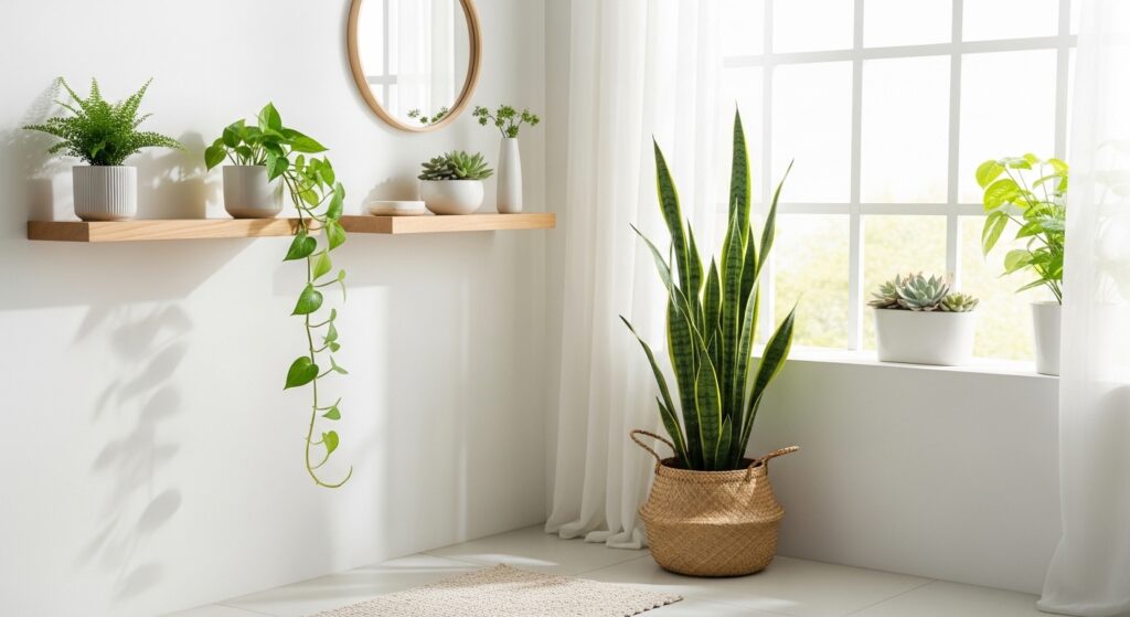 Plants also create a calming atmosphere that makes the space feel more relaxing. In my experience, low-maintenance options like ferns or snake plants work best in humid environments. This simple addition helps transform your bathroom into a space that feels fresh, balanced, and connected to nature in a subtle but meaningful way.