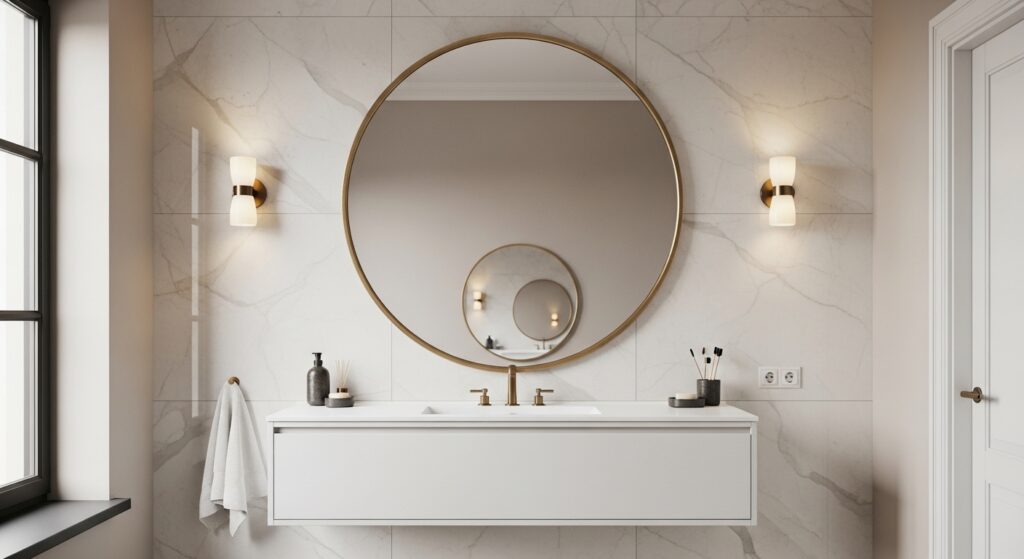 A statement mirror can completely redefine the mood of your bathroom without requiring a full makeover. Whether it’s oversized, uniquely shaped, or framed in bold materials, it naturally draws the eye and anchors the space. I’ve seen this work beautifully in both small and large bathrooms, especially when paired with clean wall finishes.