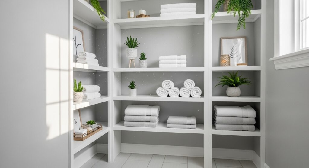 From a design perspective, these shelves also double as a styling feature. You can mix practical items like towels and toiletries with small decorative elements to create a balanced look. In my experience, keeping the color palette consistent helps maintain a clean and calming aesthetic.