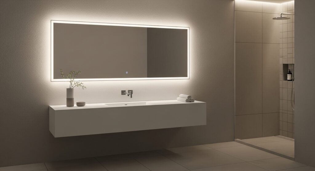 A backlit mirror introduces a soft, ambient glow that instantly elevates the mood of your bathroom. Instead of relying only on overhead lighting, this subtle illumination creates a layered lighting effect that feels both calming and functional.