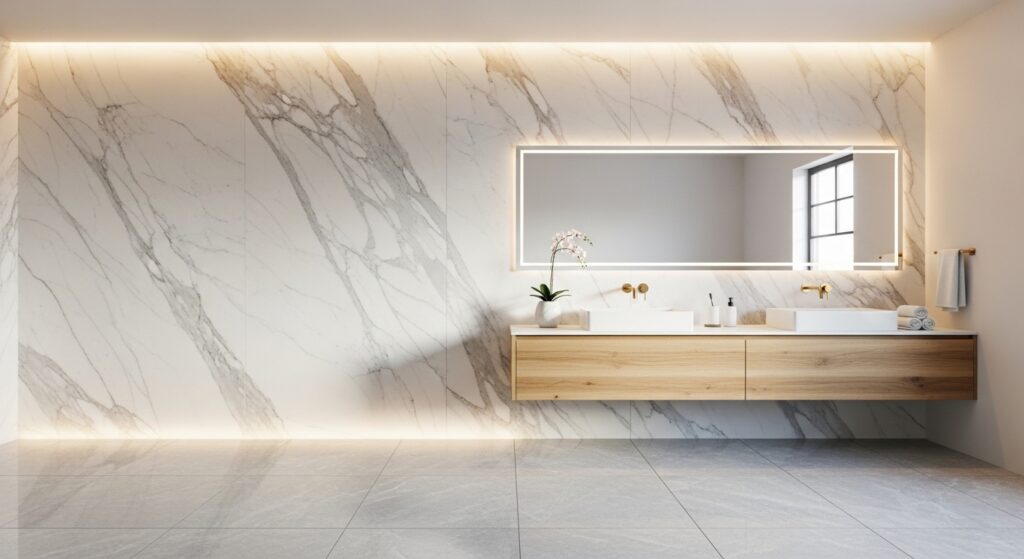 Whether real or high-quality porcelain, the key is consistency in tone and clean installation. The result is a space that feels polished, timeless, and quietly luxurious without trying too hard.