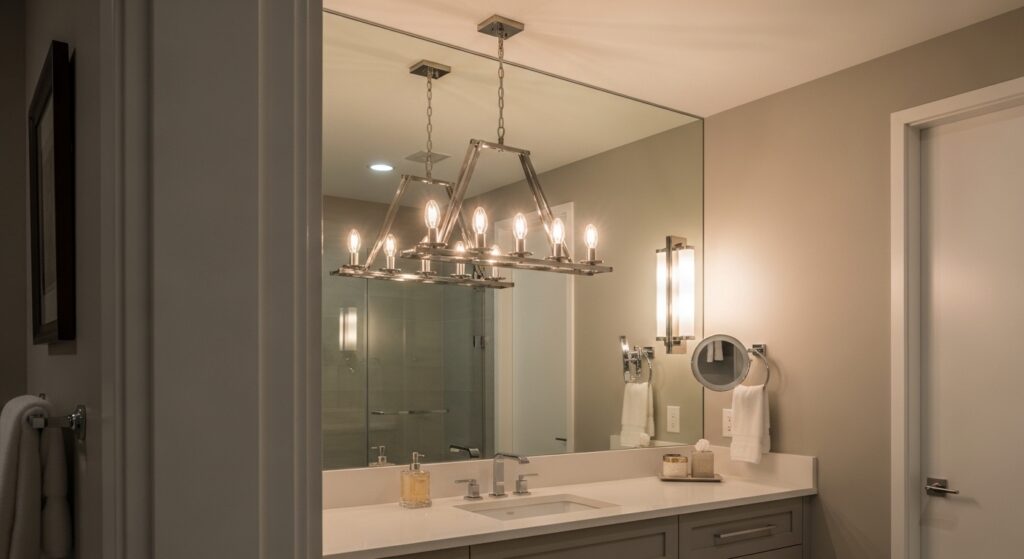 A statement light fixture can completely change the way a bathroom feels without altering the layout. Instead of blending into the background, it becomes a focal point that draws attention and adds character. I’ve noticed this works especially well in otherwise simple bathrooms where one bold element can elevate the entire design. The right fixture adds both function and visual interest, making the space feel more curated and less generic. It’s a small change with a big impact.