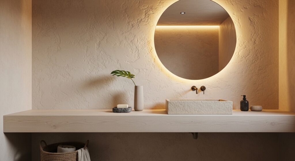 Textured wall finishes bring a subtle richness that instantly makes a bathroom feel more refined. Instead of flat, plain surfaces, the texture adds movement and visual interest without needing extra decoration. I’ve seen this work especially well in minimalist spaces where every detail matters. The soft variations in the wall create depth, making the room feel more layered and thoughtfully designed. It’s a quiet upgrade that has a strong visual effect.