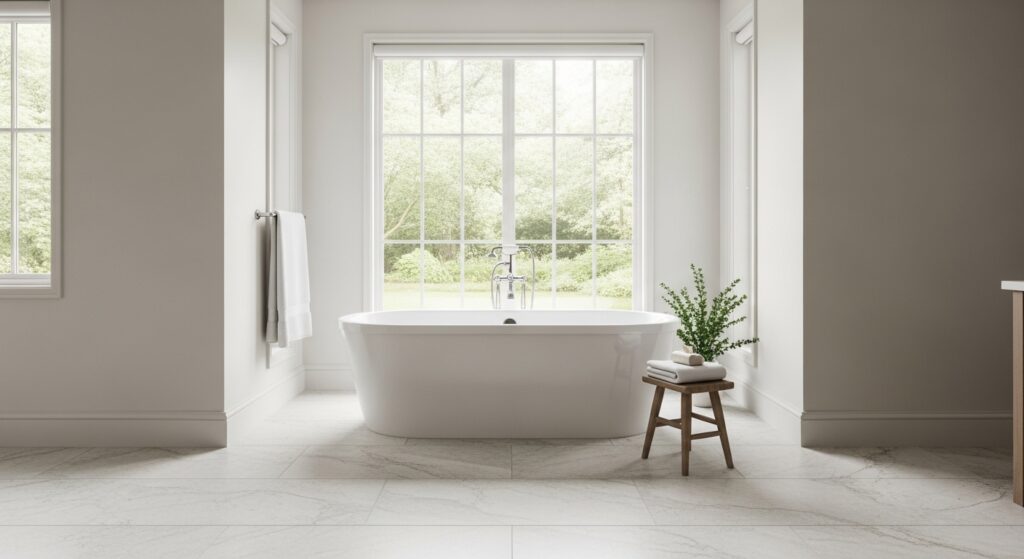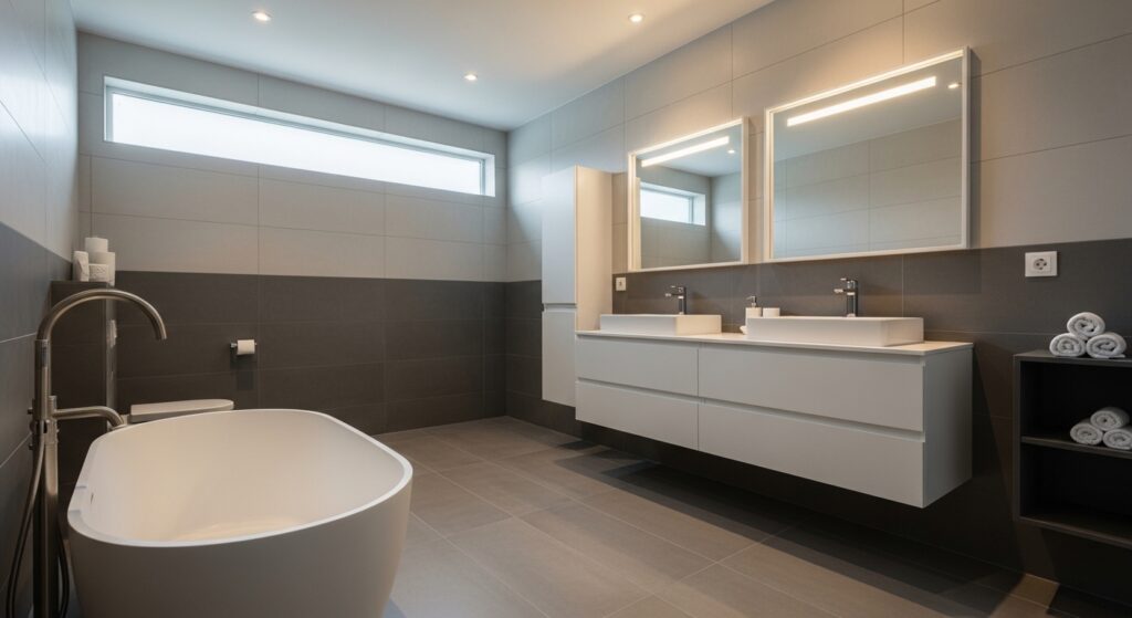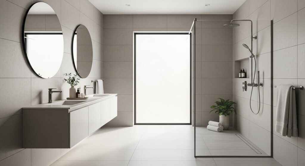 When considering Bathroom Design Ideas that improve both style and practicality, this is a strong option. The reduced grout means less visual noise and easier maintenance over time. In real homes, this often translates to a bathroom that feels fresh longer with less effort. Pairing large tiles with neutral tones enhances the seamless effect even more. The end result is a space that feels open, clean, and quietly luxurious without adding complexity.