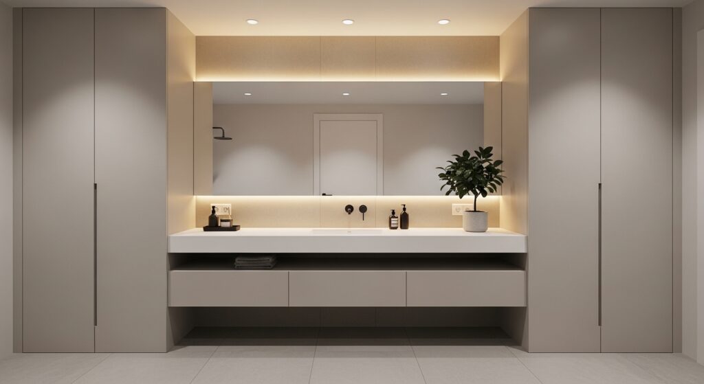 If you’re exploring Bathroom Design Ideas that look expensive without a full remodel, this is one of the smartest upgrades. The clean lines and hidden storage create a clutter-free environment, which automatically feels more luxurious.