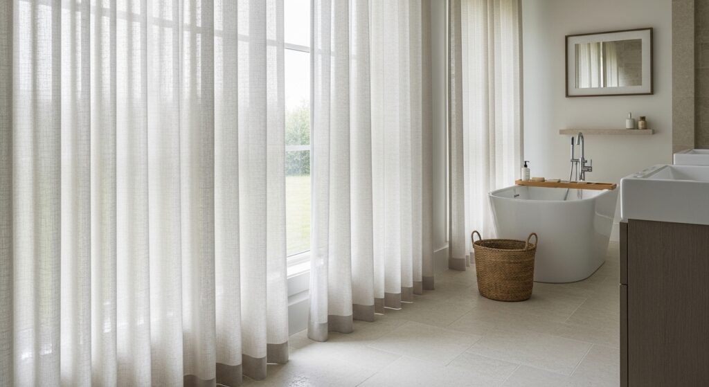 When exploring Bathroom Design Ideas that feel warm and inviting, this detail adds a quiet sense of luxury. In my experience, light fabrics like linen allow natural light to filter beautifully without blocking it completely. This creates a soft glow that enhances the entire room. Keeping the color neutral helps maintain a calm and cohesive look. The result is a bathroom that feels airy, relaxed, and thoughtfully styled with minimal effort.