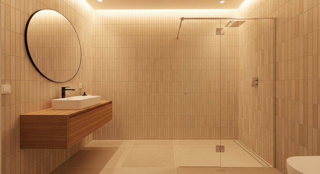 For Bathroom Design Ideas that focus on simplicity with impact, this approach is highly effective. In my experience, neutral tones work best to let the texture stand out naturally. It pairs beautifully with wood, stone, and soft lighting, enhancing the overall atmosphere. This creates a space that feels calm yet visually rich. The final result is a bathroom that feels elevated, modern, and subtly luxurious.