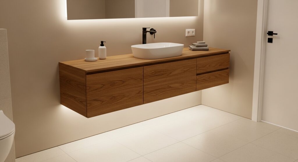 Adding subtle lighting underneath enhances the floating effect and creates a soft glow at night. In many homes, this small detail makes a big difference in both function and atmosphere. The result is a bathroom that feels thoughtfully designed, modern, and effortlessly stylish.