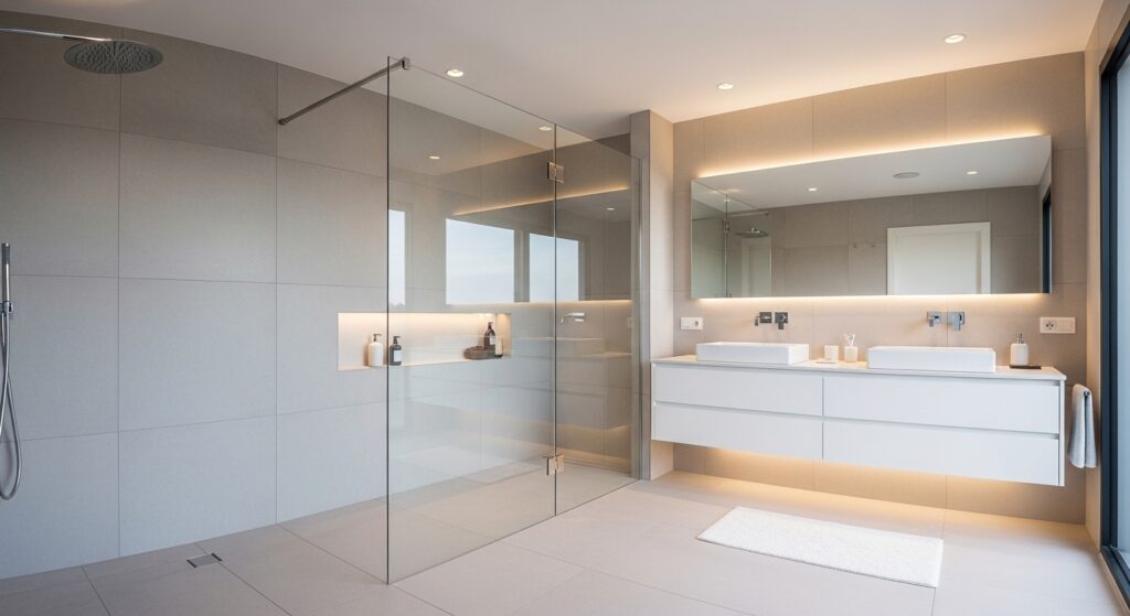 Glass partition dividers offer a smart way to define spaces without closing them off completely. They keep the bathroom feeling open while still providing functional separation between areas. I’ve noticed this works especially well in compact layouts where traditional walls would make the space feel smaller. The transparency allows light to move freely, which enhances brightness and openness throughout the room.