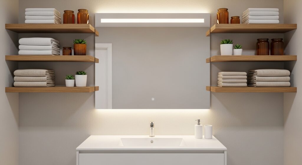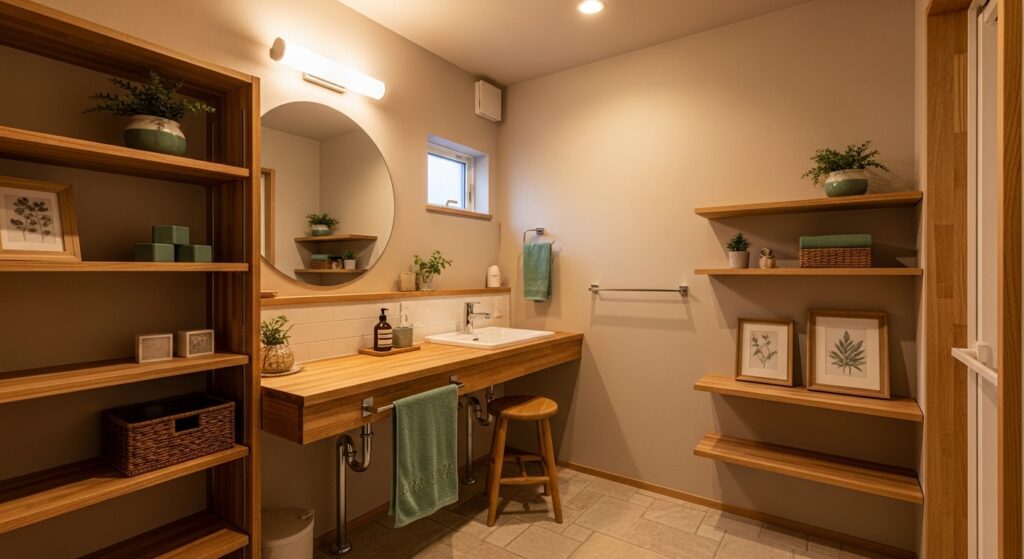 For Bathroom Design Ideas that focus on both function and style, this approach offers a perfect balance. In my experience, sticking to a limited color palette keeps the shelves looking clean and cohesive. Mixing textures like wood, glass, and fabric adds depth without clutter. This small detail can make a big difference in how the space is perceived. The end result is a bathroom that feels warm, practical, and visually appealing.