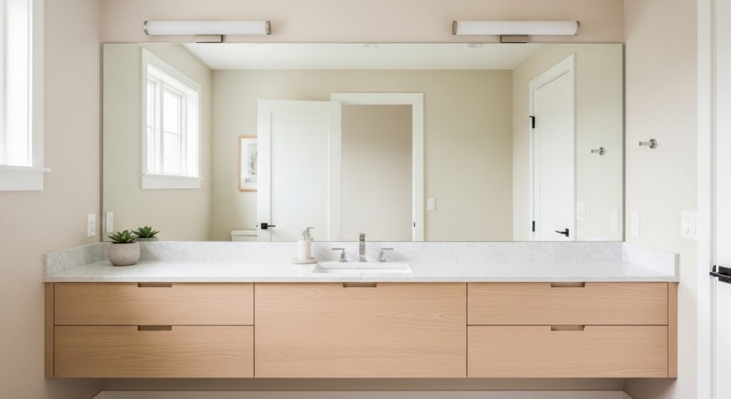 For Bathroom Design Ideas that maximize space visually, this is a highly effective solution. In my experience, pairing large mirrors with good lighting enhances the effect even more. It brightens the entire room and highlights surrounding elements. This creates a clean and polished look that feels thoughtfully designed. The result is a bathroom that feels spacious, bright, and effortlessly stylish.