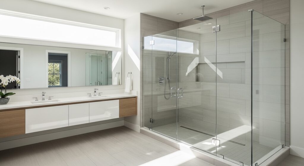 For Bathroom Design Ideas that focus on simplicity and elegance, this choice delivers both style and function. The minimal hardware keeps the look sleek, while the open design makes daily use feel less confined. In real-life use, it’s also easier to maintain visually since there are fewer edges and frames collecting grime. Pairing it with neutral tiles and modern fixtures creates a cohesive and polished look. The end result is a bathroom that feels airy, clean, and effortlessly upscale.