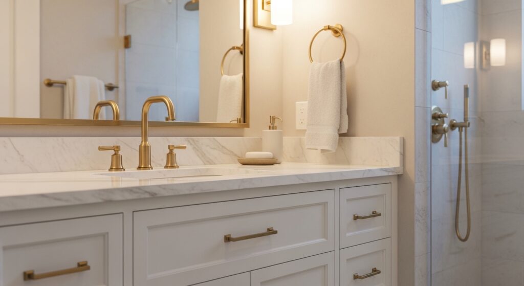Gold hardware accents bring a touch of elegance that instantly elevates the entire bathroom. The soft metallic shine catches the light in a way that feels warm and refined rather than flashy. I’ve noticed that even small details like handles and faucets can shift the overall mood of the space. It’s a simple update, but it creates a strong impression of quality and attention to detail. This is why many designers use gold as a finishing touch rather than the main feature.