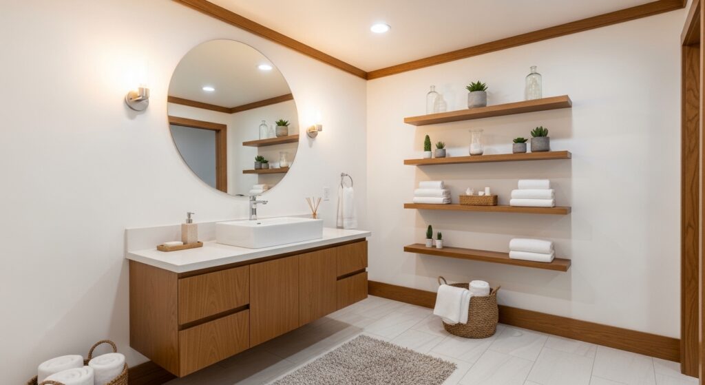 Open shelving is a simple way to combine storage and style in one clean move. Instead of bulky cabinets, these shelves keep the space feeling light while still being functional. I’ve seen this work especially well in smaller bathrooms where closed storage can feel too heavy or crowded.