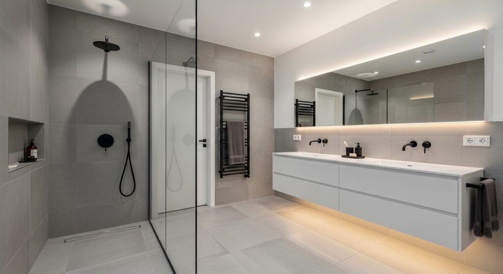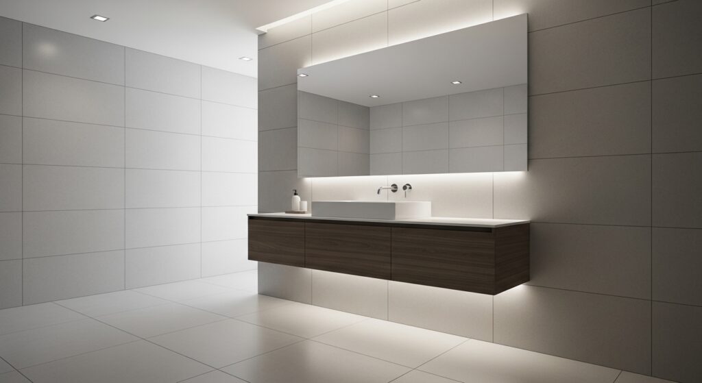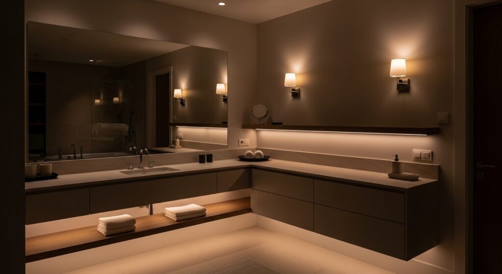 This type of lighting also highlights textures and design details in a subtle way. It adds depth without overpowering the space, making everything feel more cohesive. The result is a bathroom that feels comfortable, modern, and thoughtfully designed for both function and relaxation.