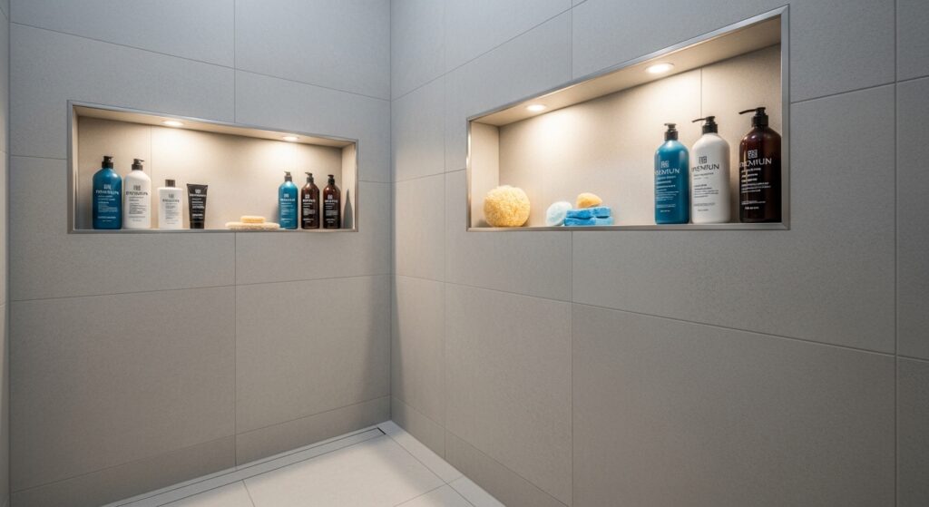Recessed niches are one of those details that feel small but make a big impact. Instead of adding shelves that stick out, everything is built directly into the wall. I’ve noticed this keeps the space looking much cleaner and more organized.