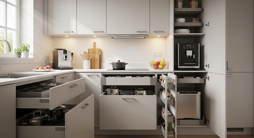 What makes this idea so valuable is its long-term impact. Once your kitchen is organized properly, it becomes easier to maintain. Pull-out drawers and hidden compartments improve accessibility while keeping surfaces clean and minimal. This approach creates a more efficient workflow, making the kitchen feel less stressful and more enjoyable to use. It’s a practical upgrade that delivers lasting results.