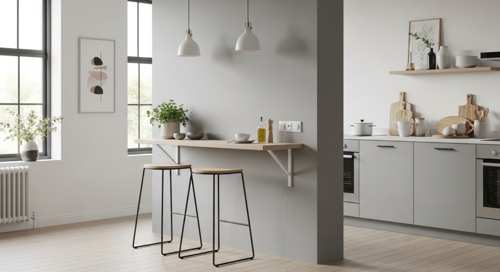 This idea is perfect when you want functionality without sacrificing space. A floating breakfast bar gives you a dedicated spot for quick meals, coffee breaks, or even light work without adding bulky furniture. I’ve noticed this works especially well in smaller kitchens where every inch matters. Because it’s attached to the wall, it keeps the floor area open and makes the entire space feel less crowded and more breathable.