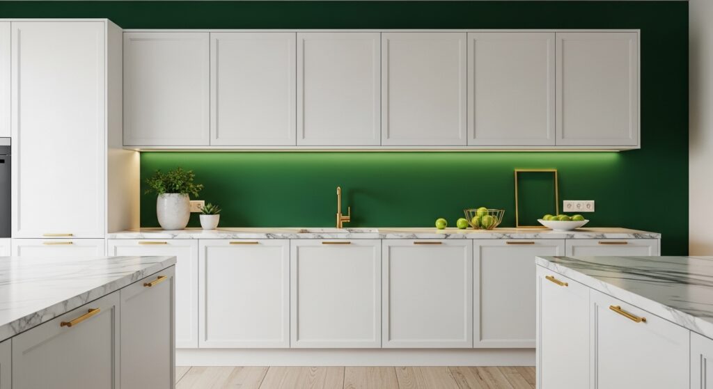 A bold accent wall can completely change the mood of your kitchen without requiring a full redesign. It introduces depth and character in a controlled way, making the space feel more expressive and intentional. I’ve seen this work especially well when the rest of the kitchen remains neutral, allowing the color to stand out without overwhelming the design. It becomes a natural focal point that draws attention and adds energy.