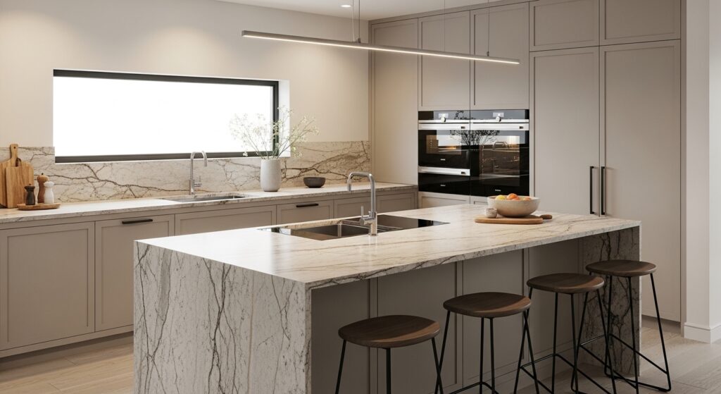 Natural stone countertops bring a sense of authenticity and luxury that’s hard to replicate. Each slab has unique patterns, making your kitchen feel one-of-a-kind. I’ve noticed that this material instantly elevates even simple designs, giving them a more refined and polished appearance. It creates a strong visual foundation that ties the entire space together.