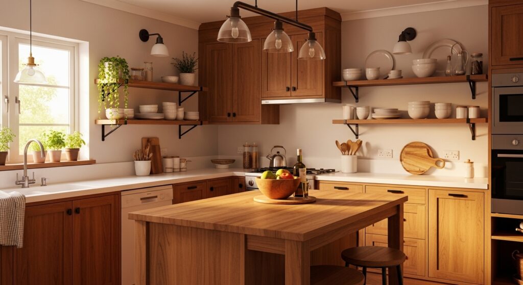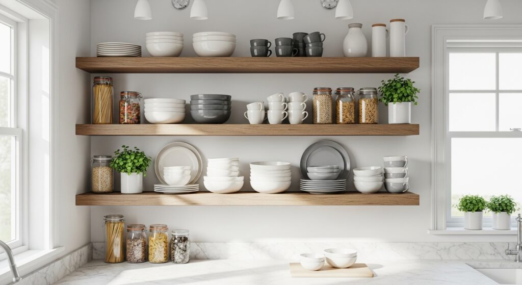 What makes this setup powerful is how flexible it is for different styles and budgets. You can use simple wooden planks or sleek floating shelves depending on your aesthetic. This is one of those Kitchen Design Ideas that grows with you over time because you can easily refresh it by rearranging items. The result is a kitchen that feels curated but not staged, practical yet stylish. It encourages you to keep things tidy while giving your space a personal, intentional touch that guests always notice.