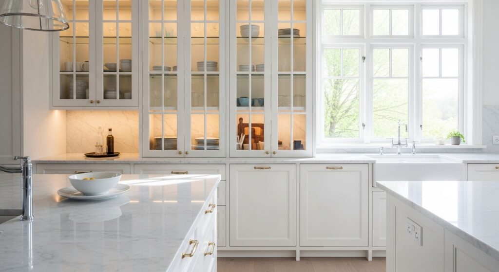 This design detail creates a balance between openness and structure without removing storage completely. Glass cabinet doors allow you to display items while still keeping everything organized behind a protective layer. I’ve seen this work especially well in kitchens that feel heavy due to too many solid cabinets. The transparency softens the look and adds a sense of depth that makes the space feel more expansive.