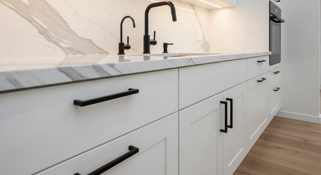 Sometimes the smallest details create the biggest impact, and hardware is a perfect example. Switching to matte black instantly sharpens the look of your kitchen, giving it a modern edge without changing the entire setup. I’ve noticed that even outdated cabinets start to feel refreshed with this simple swap. It creates contrast that draws the eye in a subtle but effective way.